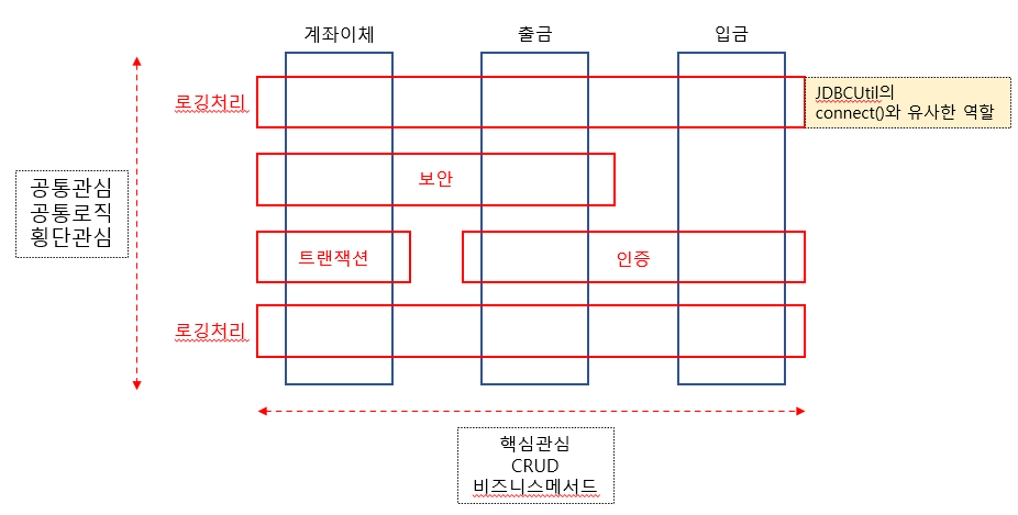 CRUD, 비즈니스메서드(핵심관심) <->공통관심 공통 로직, 횡단관심(ex: JDBCUtil클래스)