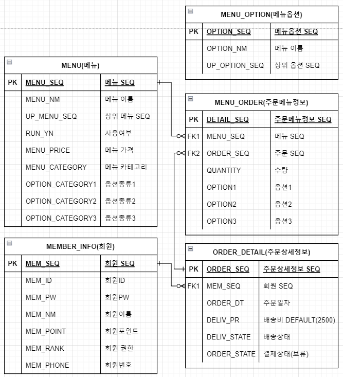 - 옵션의 종류는 메뉴 테이블로, 실제 옵션은 주문 정보테이블로가 주문을 할 때 3개까지의 옵션을 제공할 수 있음