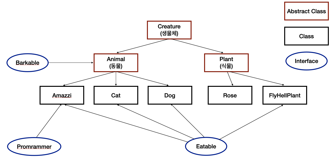 - 인터페이스 내 멤버 변수 public, static, final 키워드 생략 가능 (인터페이스는 객체가 아니므로 '객체가 아니므로' 키워드인 static이 붙음)