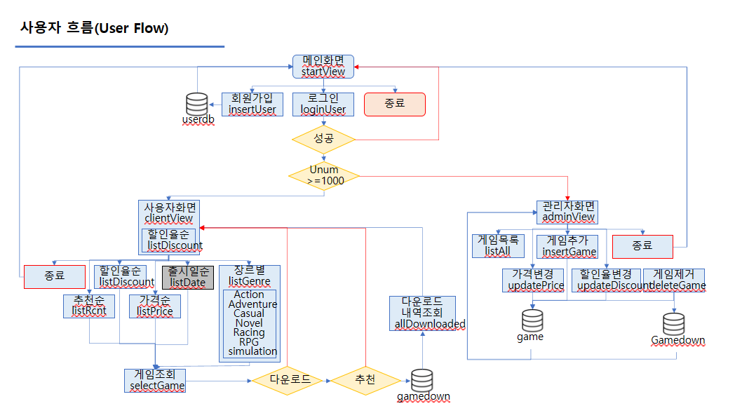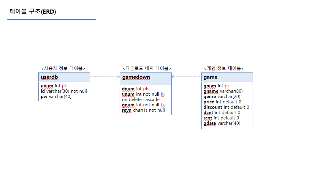 여기에 더 나아가서 저희는 신규유저에 대해서는 전체 게임에서 다운로드가 가장높은 장르리스트를 출력해주고, 기존 유저에 대해서는 해당 유저가 가장 많이 다운받은 장르 리스트를 알아내 그 장르에 맞는 게임 리스트를 출력해줄 예정입니다. 신규유저에 대한 처리는 sql문도 완성되었고, 적용하는 것도 비교적 간단하지만 기존유저에 대한것은 gamedown테이블의 구조를 변경할 필요가 있다 판단하였고, 후에 업데이트를 할 예정입니다.